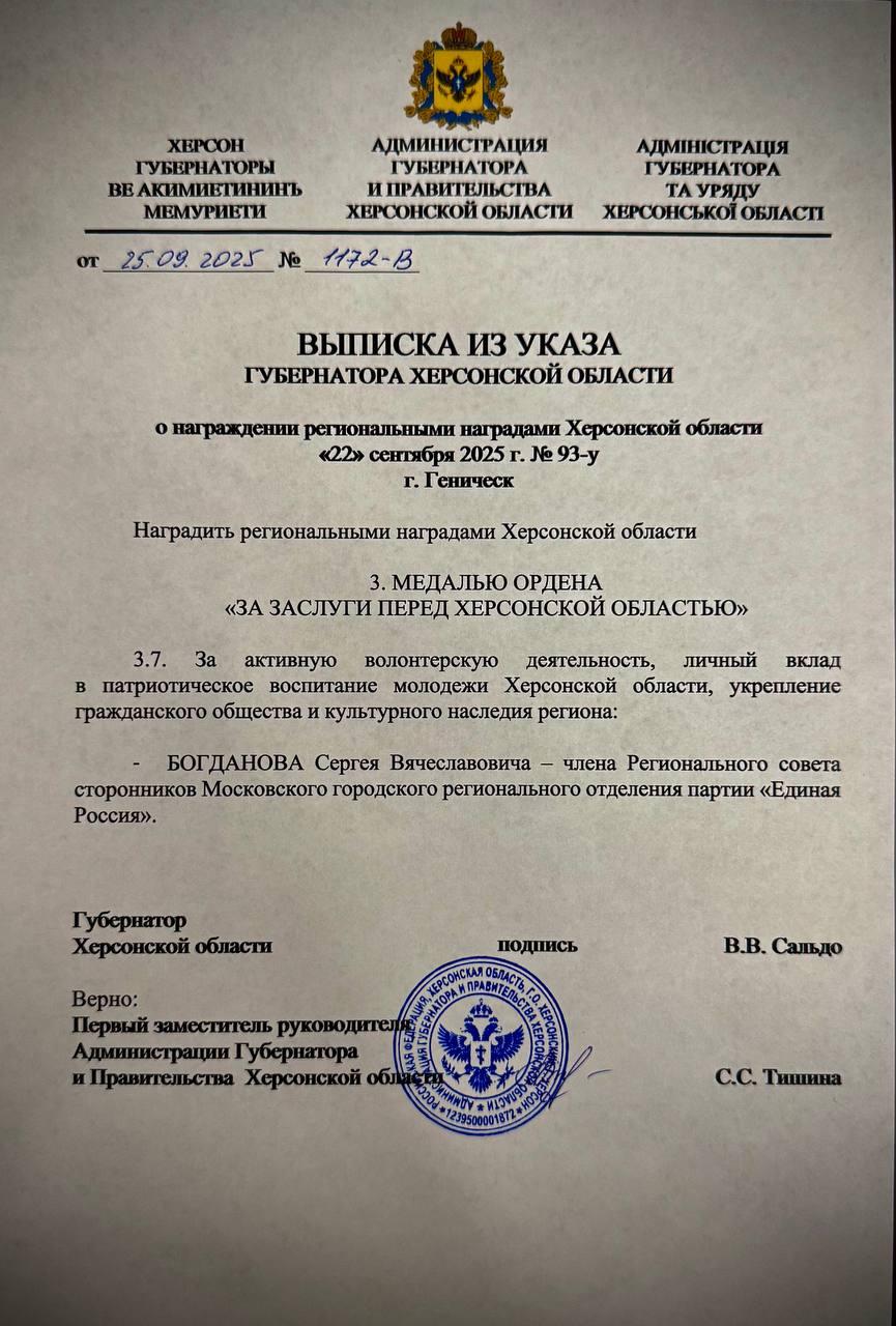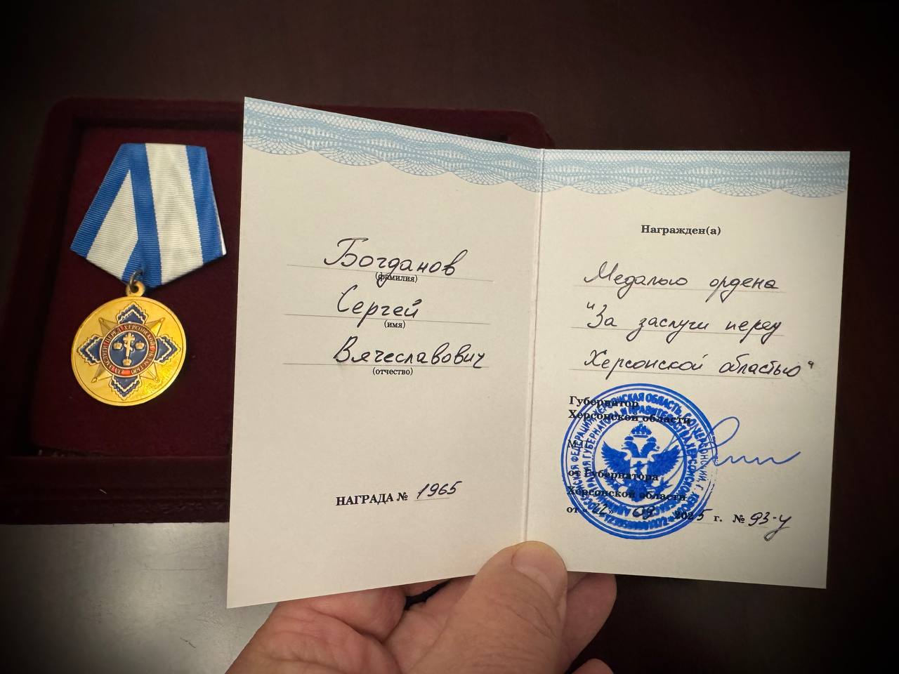 В преддверии празднования 3-й годовщины Дня воссоединения Донецкой и Луганской Народных Республик, Запорожской и Херсонской областей с Российской Федерацией губернатором Херсонской области Владимиром Васильевичем Сальдо был подписан указ о награждении региональными наградами Херсонской области. По поручению губернатора Херсонской области, в постоянном представительстве Херсонской области в Москве в торжественной обстановке заместитель губернатора, руководитель постоянного представительства Херсонской области при Правительстве Российской Федерации Боделан Владимир Русланович вручил медаль ордена «За заслуги перед Херсонской областью» Богданову Сергею Вячеславовичу.
